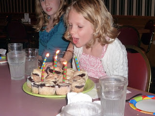 Last Thursday evening we had some youngsters at our "old people" Thursday night gathering. At left Grandma is lighting the candles on the birthday cupcakes.